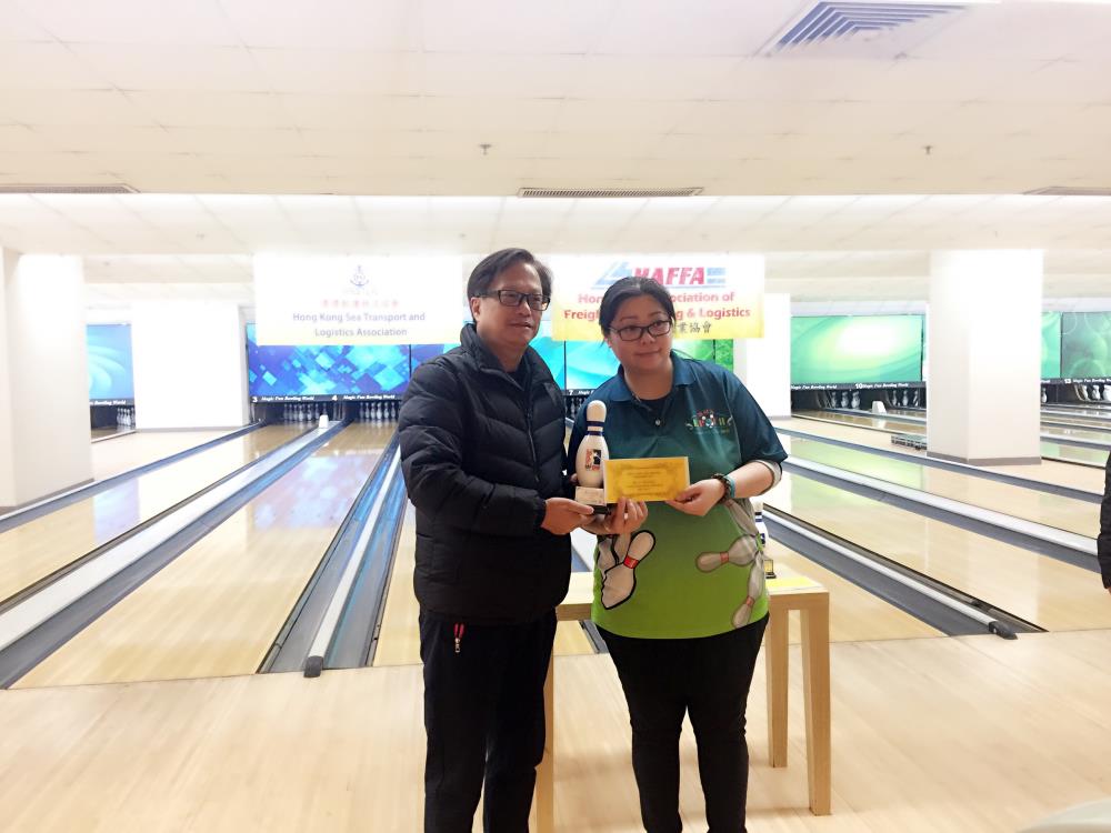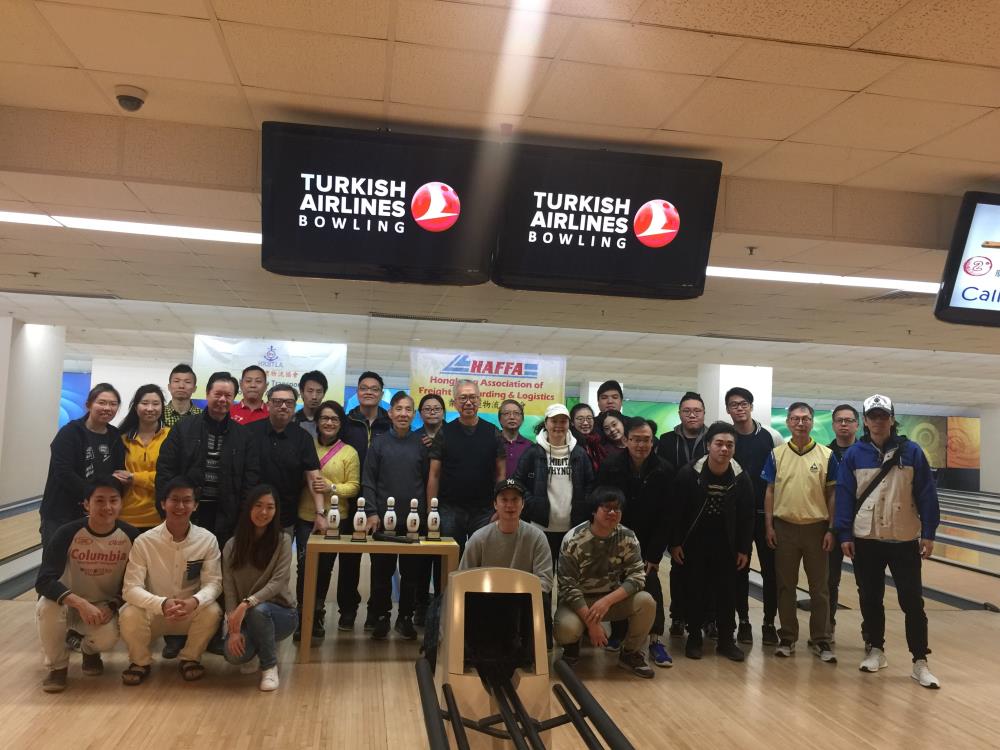 HAFFA/HKSTLA Joint Bowling Tournament, 17 December 2017 Supported by Hong Kong Logistics Management Staff Association (HKLMSA), HAFFA collaborated with the Hong Kong Sea Transport and Logistics Association (HKSTLA) for its seventh year to organize a Bowling Tournament on 17 December 2017 at Magic Fun Bowling World, Tsuen Wan. A total of 10 teams signed up for the tournament to contend for five awards after four games. Congratulations to the winners, they were: Team Champion | - Star Rainbow Logistics Hong Kong Limited | Team 1st Runner-up | - Grand Light (Int'l) Shipping Co. | Team 2nd Runner-up | - Scanwell Logistics (Hong Kong) Limited (Team 1) | Best Female Bowler | - Ms. Kimberly Lau Star Rainbow Logistics Hong Kong Limited | Best Male Bowler | - Mr. Ng Cheung Wah Star Rainbow Logistics Hong Kong Limited |