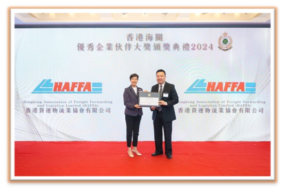 (4) HAFFA has received the Elite Enterprise Partnership Award from the Hong Kong Customs & Excise Department for the second consecutive year. I am deeply honored to accept this award on behalf of HAFFA and its Members from the Commissioner for Customs and Excise, Ms. Louise Ho in October 2024. This recognition underscores our commitment to fostering cooperation and support in Customs enforcement. We are dedicated to further enhancing our collaboration with the Customs and Excise Department to elevate the logistics industry in Hong Kong. First introduced in 2022, this award commends stakeholders in the logistics and intellectual property sectors for their proactive contributions to Customs. This year, HAFFA was recognized alongside 17 other organizations from various sectors, including logistics, container and terminal companies, express couriers, and trademark representatives. |
