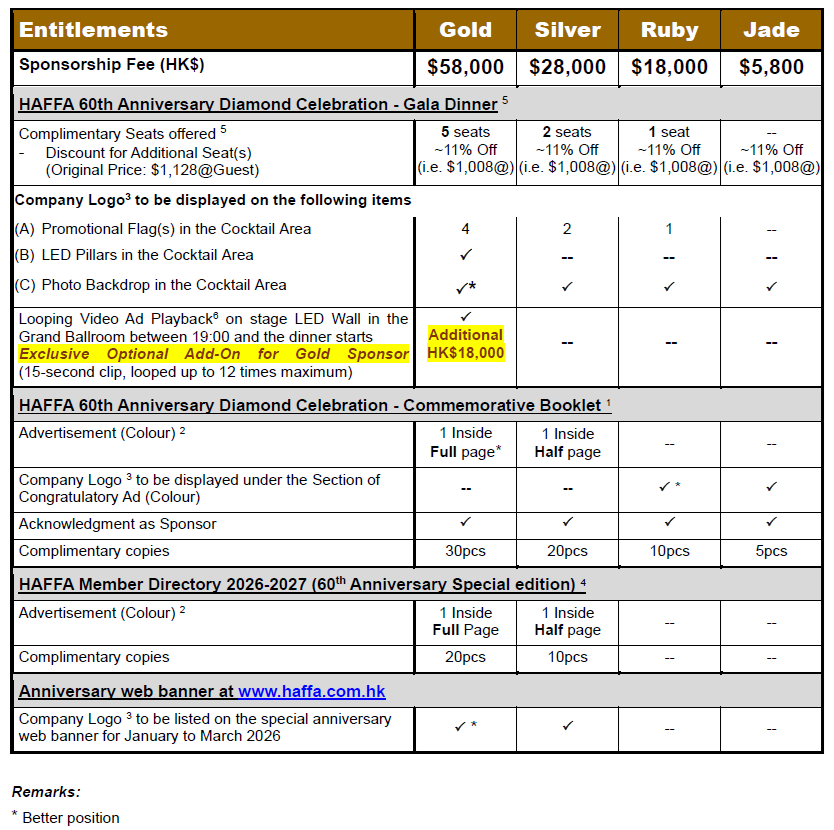 我們誠摯邀請各位會員把握這個難得的機會,成為鑽禧會慶的贊助商。您的慷慨支持不僅能促成這場意義非凡的盛典圓滿舉行,更能有效提升企業形象,擴大品牌曝光,觸及更多潛在客戶,讓您的企業在業界與社群中更受矚目。贊助計劃(下載)詳情請參閱附件一。我們期望得到會員的鼎力支持,煩請於2025年11月21日(星期五)或之前填妥回條(附件二),以電郵(galadinner@haffa.com.hk)或傳真(2796 3719) 交回HAFFA秘書處。