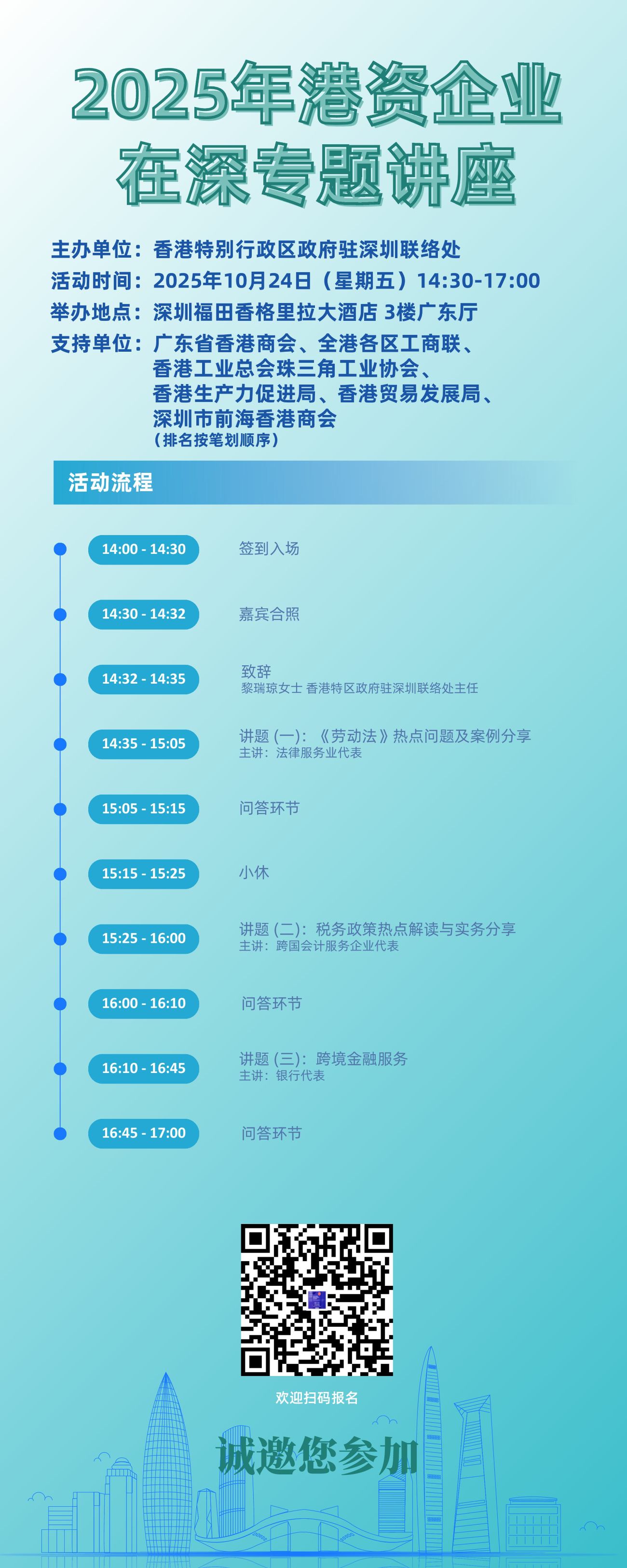 “2025年港資企業在深專題講座” (2025年10月24日) 香港特別行政區政府駐粵經濟貿易辦事處將於2025年10月24日(星期五)在深圳市舉辦“2025年港資企業在深專題講座”。 活動詳情: 時間:2025年10月24日下午2:30至5:00 地點:深圳福田香格里拉大酒店3樓廣東廳 (地址:中國深圳福田區益田路4088號) 主辦:香港特別行政區政府駐粵經濟貿易辦事處(駐粵辦) 語言:普通話 形式:線下活動 活動流程: 14:00 - 14:30 簽到入場