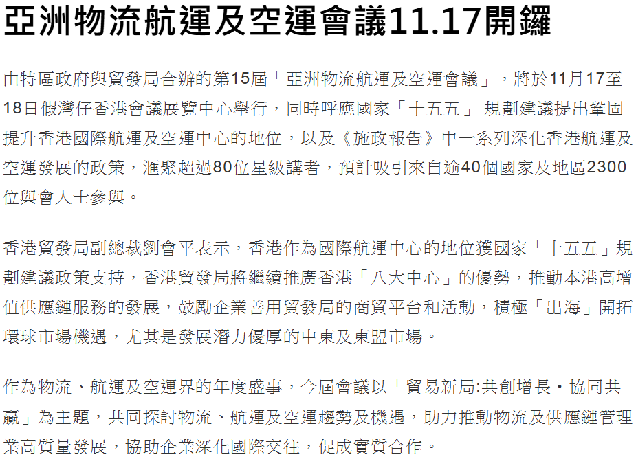 Media Interview with HAFFA Chairman - 亞洲物流航運及空運會議11.17開鑼 (信報)