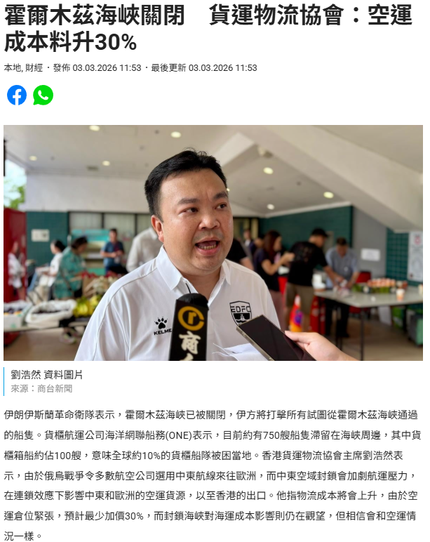 霍爾木茲海峽關閉 貨運物流協會:空運成本料升30%