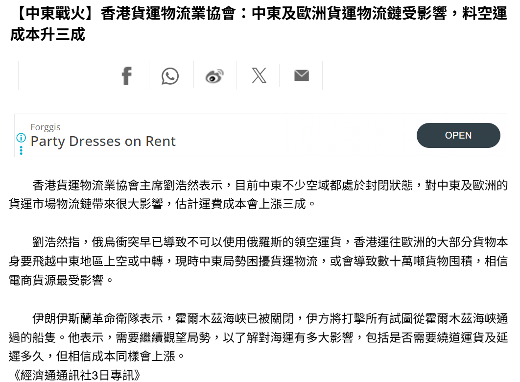 【中東戰火】香港貨運物流業協會:中東及歐洲貨運物流鏈受影響,料空運成本升三成