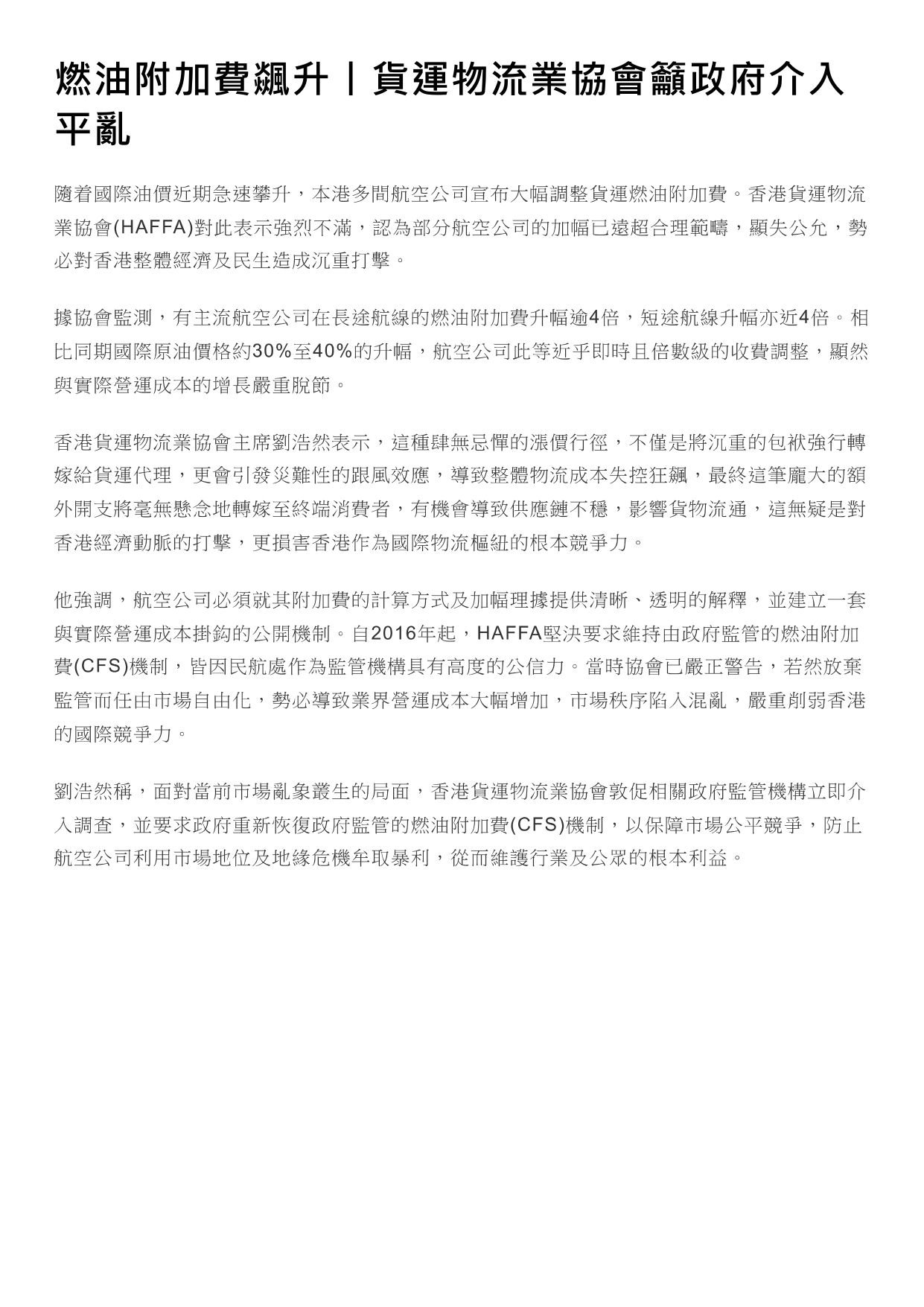 Media Interview with HAFFA Chairman - 燃油附加費飊升丨貨運物流業協會籲政府介入平亂 (信報)